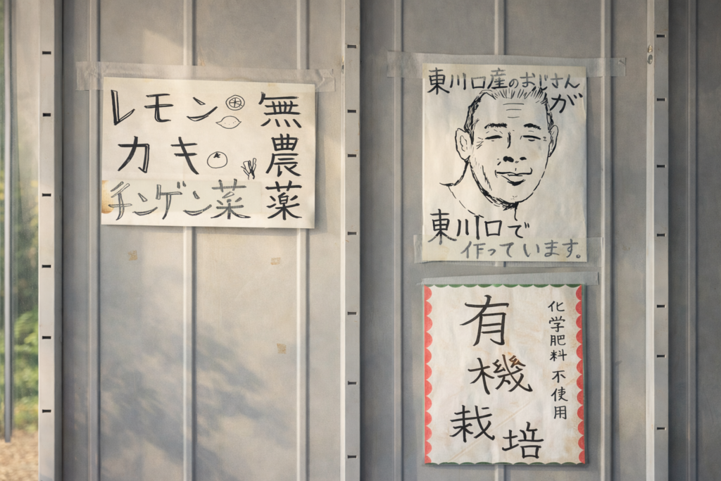 ― 無人店舗での張り紙 ― ここには物語がある 土の匂いがある 確かな営みがある 未来を信じ 生きていくしかない。 -